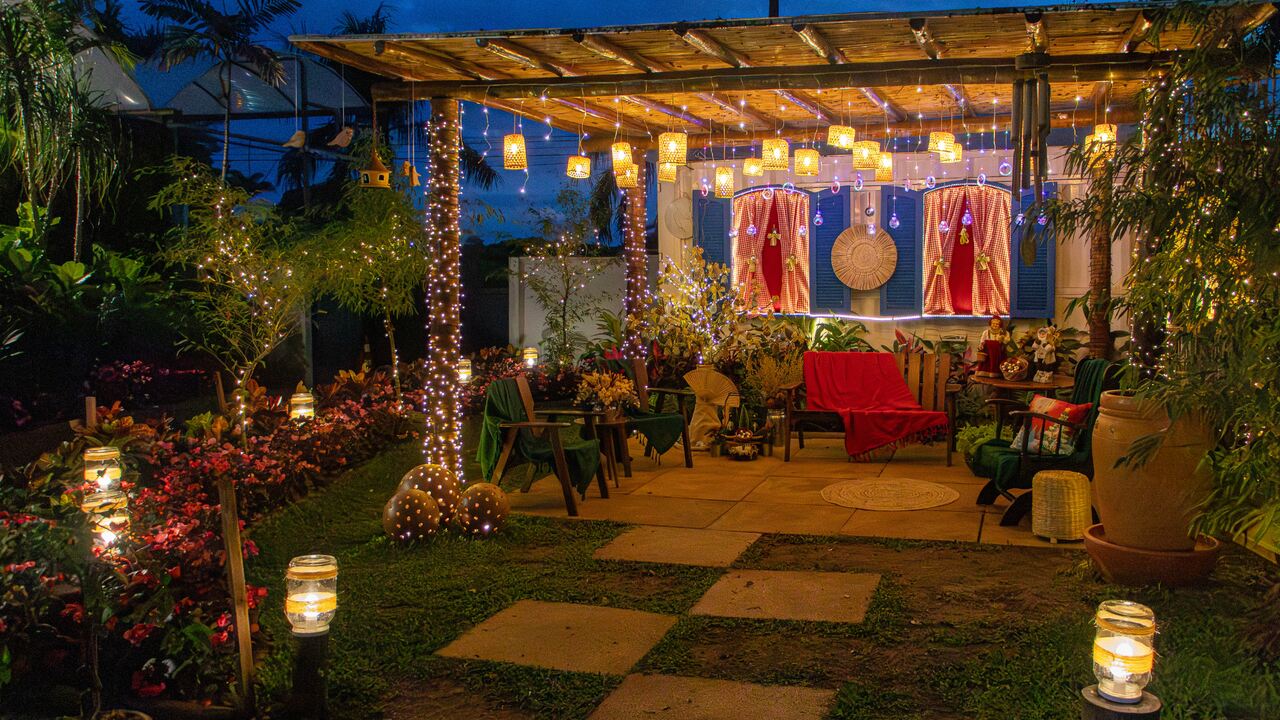 Em “O Jardim que Celebra o Natal”, Neide Tobias e Carla Dadazio criam um cenário para viver as festas durante todo o dia. Três momentos se conectam em perfeita harmonia: piquenique, ceia e descanso. Na entrada, a área de piquenique ressignifica o antigo redário, agora iluminado por cordões de luz, almofadas e uma mesa repleta de delícias. Um dos pilares, envolto por fitas de LED, se reinventa como árvore de Natal vertical. À noite, o clima é de filme ao ar livre.