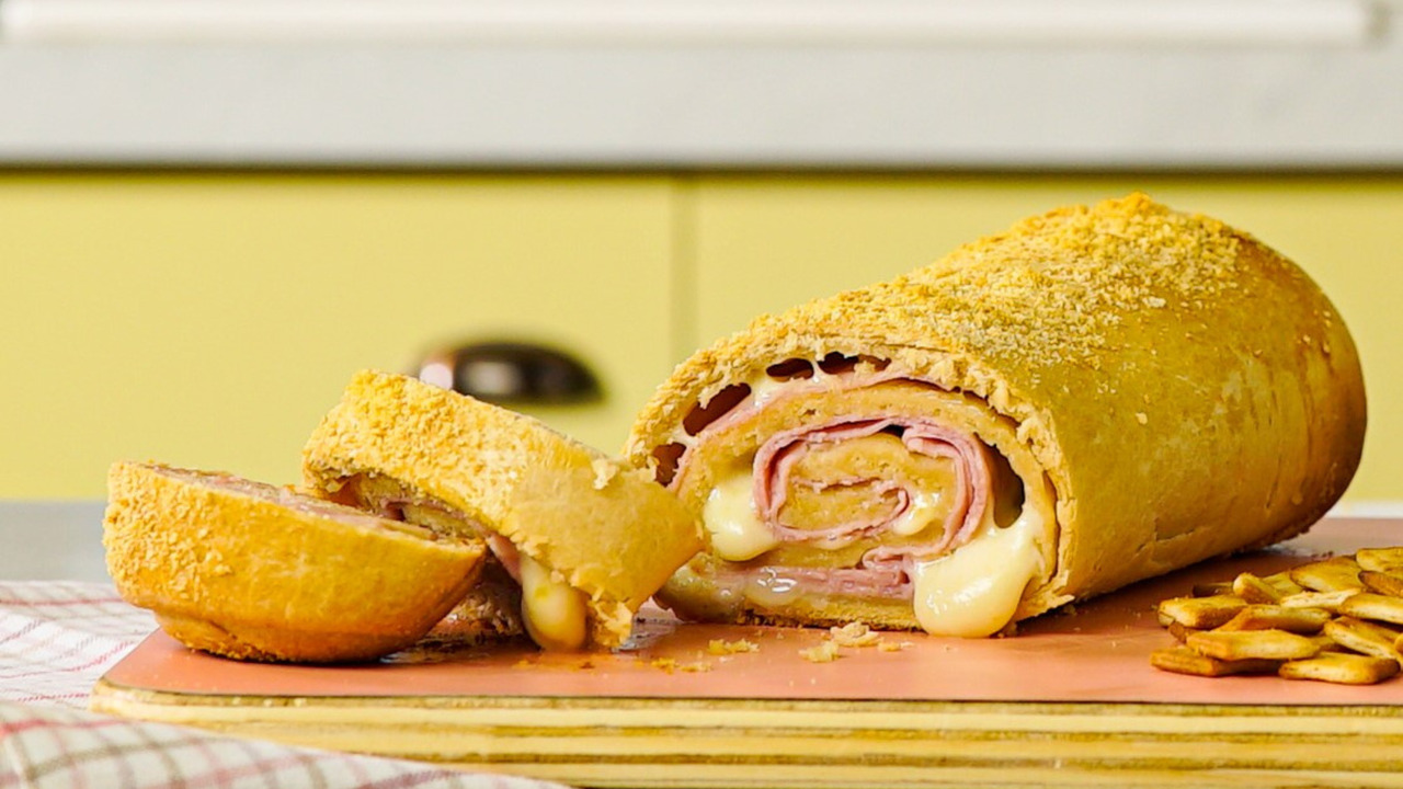 Uma massa caseira feita com biscoito Presuntinho esfarelado, recheada com presunto e muçarela, e finalizada com uma cobertura crocante de presuntinho.
