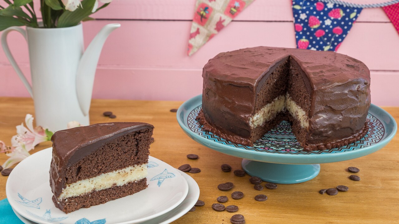 - Retire o bolo do forno, deixe esfriar, desenforme e corte ao meio na horizontal.