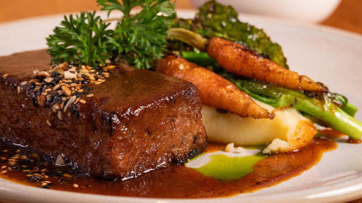 Acompanhamentos equilibram textura e técnica: purê de batata aveludado, legumes salteados, dukkah e arroz com milho verde finalizado com manteiga de garrafa.