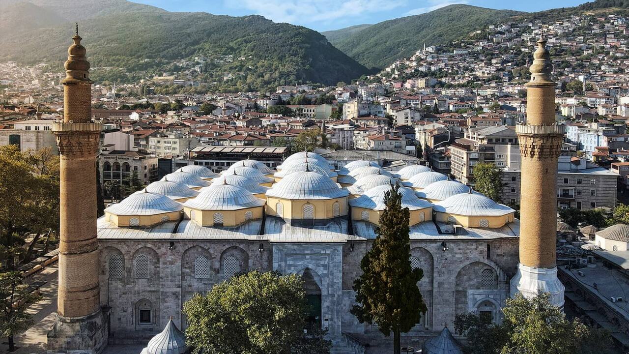 O amanhecer em Bursa é especial; banhada em tons de dourado pelo sol que surge atrás das montanhas Uludağ, que desperta lentamente. O ponto de partida é a imponente Grande Mesquita (Ulu Cami), construída no século XIV, e um marco da arquitetura otomana.